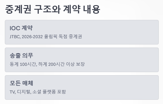 이 계약에는 동계올림픽은 최소 100시간, 하계올림픽은 최소 200시간을 전국 송출 채널에서 보장해야 한다는 조항이 포함되어 있어요.