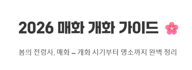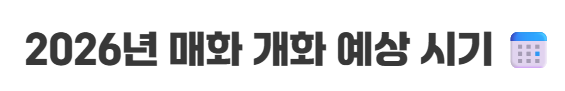 1. 2026년 매화 개화 시기: 남부 지방은 2월 말 ~ 3월 초, 중부 지방은 3월 중순 ~ 3월 말 예상. (변동 가능)