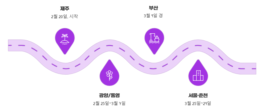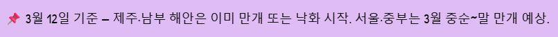 3월 초중순에는 광양, 구례 등 남부 내륙으로 확대되고, 서울 등 중부 지방에서는 3월 중순에서 3월 말까지 기대해볼 수 있어요.