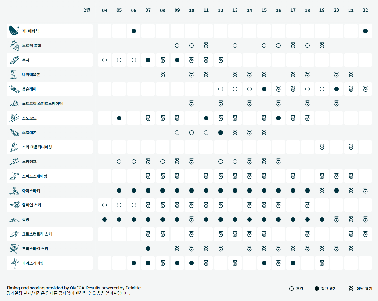 | 주요 경기 | 2월 7일 ~ 2월 21일 | 밀라노, 코르티나 담페초 외 다수 | 쇼트트랙, 피겨 스케이팅, 스키, 스노보드 등 |