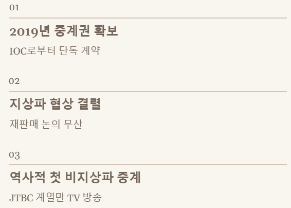 덕분에 이번 대회는 올림픽 역사상 처음으로 지상파 중계 없이 비지상파 채널인 JTBC 계열 채널을 통해서만 시청이 가능하게 되었습니다.