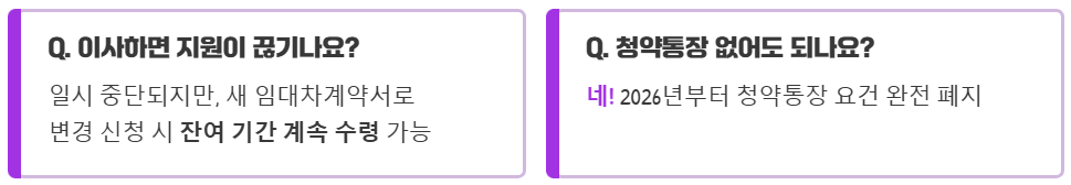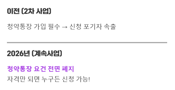 이번 2026년 청년월세지원에서 가장 눈에 띄는 변화는 바로 청약통장 가입 요건이 사라졌다는 점이에요!