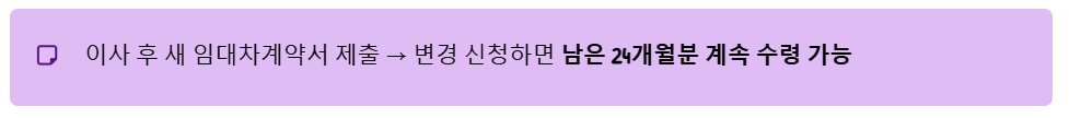 하지만 새로운 임대차계약서를 구비하여 변경 신청을 하면 남은 24개월분의 월세를 계속해서 받을 수 있습니다.