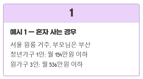 ⇒ 청년가구: 1인(본인), 소득 월 154만원 / 원가구: 3인(본인+부모), 소득 월 536만원 이하