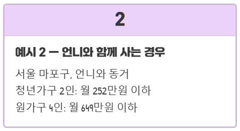 ⇒ 청년가구: 2인(본인, 언니), 소득 월 252만원 / 원가구: 4인(본인, 언니+부모), 소득 월 649만원 이하
