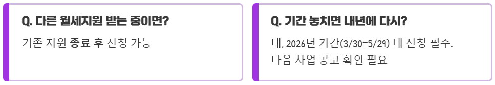 A3: 다른 월세지원 사업(지자체 월세지원, 국토부 2차 청년월세 한시 특별지원 등)을 통해 이미 혜택을 받고 있는 경우에는 이번 2026년 청년월세지원 대상에서 제외됩니다.