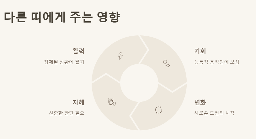 붉은 말띠의 기운은 특정 띠에만 국한되지 않습니다. 모든 띠에게 활력과 변화의 기운을 가져다줄 수 있죠. 붉은 말띠 해의 열정적인 에너지는 정체된 상황에 활기를 불어넣거나, 새로운 도전을 시작하는 데 긍정적인 영향을 줍니다. 특히, 변화를 두려워하지 않고 능동적으로 움직이는 띠들에게는 더 큰 기회가 찾아올 수도 있습니다.