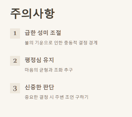 | 재물/투자 | 과감한 투자보다는 신중한 접근이 필요합니다. 열정적인 만큼 리스크도 따를 수 있으니, 충분한 정보 수집과 분석이 중요해요. |