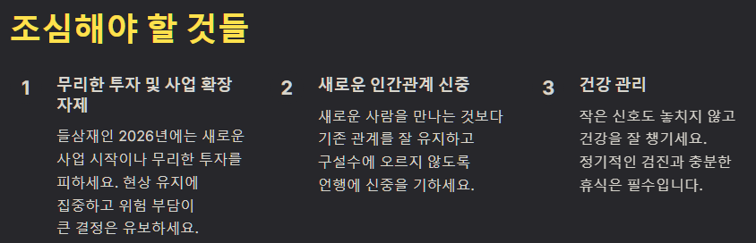 A: 2026년은 들삼재의 해이므로, 특히 새로운 시작이나 큰 변화를 주는 일에는 신중을 기하는 것이 좋습니다. 무리한 투자나 사업 확장, 새로운 인간관계에 대한 지나친 개방보다는 기존의 것을 안정적으로 유지하고 내실을 다지는 데 집중하세요. 건강 관리와 함께 마음을 차분히 다스리는 것도 중요합니다.
