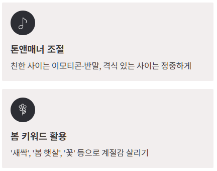 - 4. 봄의 희망을 메시지에 담아! '새싹', '봄 햇살', '꽃' 등의 키워드를 활용하면 좋습니다.