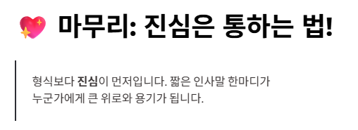 ⚠️ 주의: 격식을 갖춰야 하는 관계에서는 너무 과한 이모티콘이나 비공식적인 표현은 피하는 것이 좋아요.
