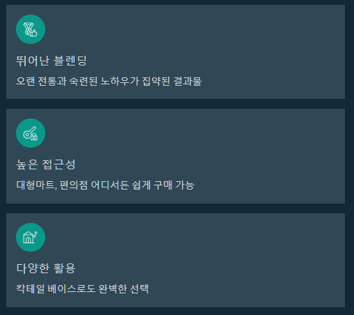 | 조니워커 레드 라벨 | 2만원 후반 ~ 3만원 초반 | 강렬한 스모키, 스파이시, 시트러스 | 하이볼, 칵테일 |