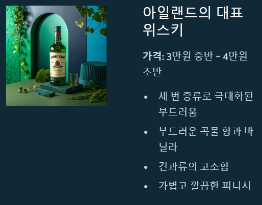 | 제임슨 스탠더드 | 3만원 중반 ~ 4만원 초반 | 세 번 증류, 부드러운 곡물, 바닐라 | 스트레이트, 칵테일 |