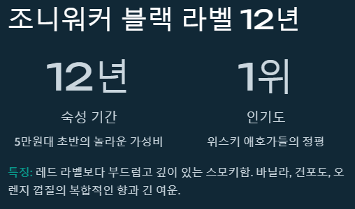 | 조니워커 블랙 라벨 12년 | 5만원대 초반 (할인 시) | 12년 숙성, 깊이 있는 스모키, 복합미 | 스트레이트, 온더락 |