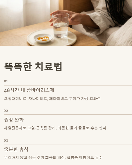 - 3. 증상 발현 48시간 내 항바이러스제 투여가 중요하며, 충분한 휴식과 수분 섭취가 필수입니다.