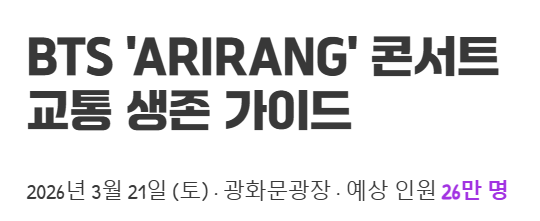 오는 2026년 3월 21일 토요일, 서울 광화문광장이 BTS 'ARIRANG' 컴백 라이브로 뜨겁게 달아오릅니다! 26만 명의 아미(ARMY)와 시민들이 몰릴 것으로 예상되는 만큼, 서울시는 대규모 종합 교통대책을 발표했어요. 혹시 당일 광화문 근처를 방문할 계획이 있으시다면, 이 완벽 교통 생존 가이드를 놓치지 마세요. 막히지 않고 편안하게, 그리고 안전하게 콘서트를 즐기거나 이동할 수 있도록 핵심 정보들을 꼼꼼하게 정리했습니다!