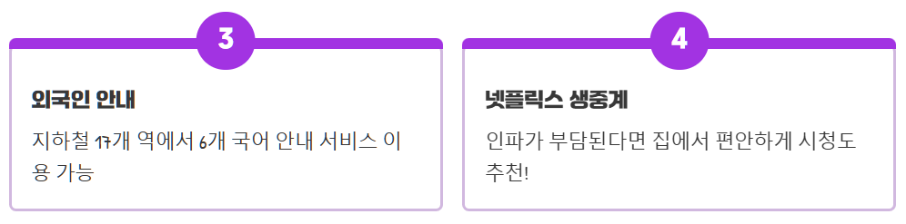 - ✅ 외국인은 지하철 17개 역에서 6개 국어 안내 이용 가능: 외국인 아미들도 걱정 없이 이용할 수 있도록 배려된 서비스이니 적극 활용하세요.