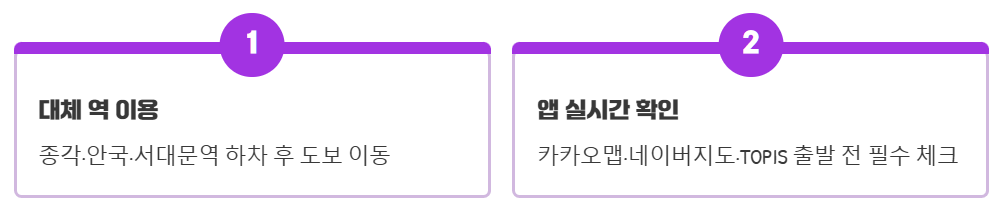 - ✅ 현장 방문 시 종각역·안국역·서대문역 하차 후 도보 이동: 폐쇄되는 광화문역 대신 조금 더 걸어서 편안하게 도착하세요.